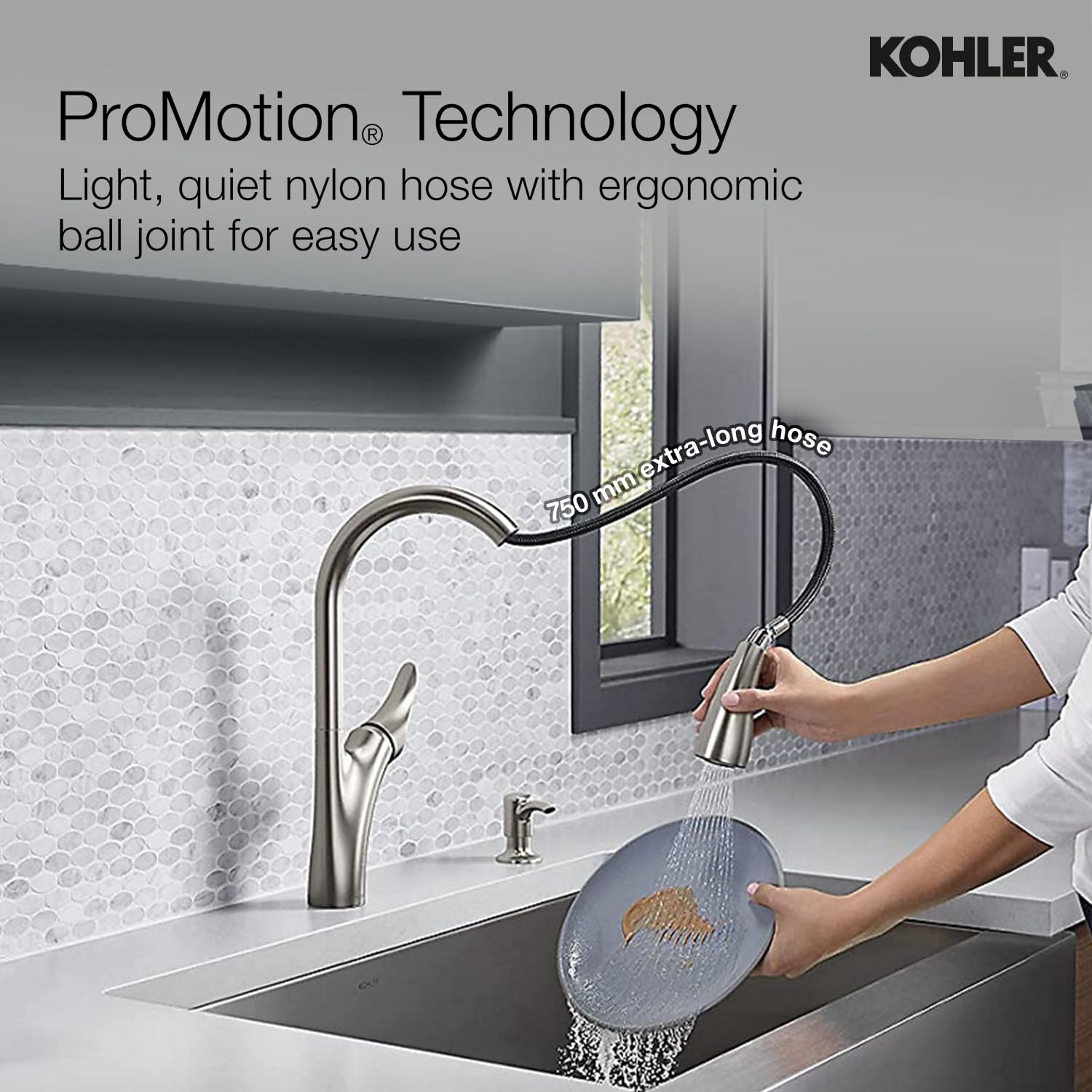 - ProMotion technology allows the pull-down sprayhead to swivel for more comfortable use