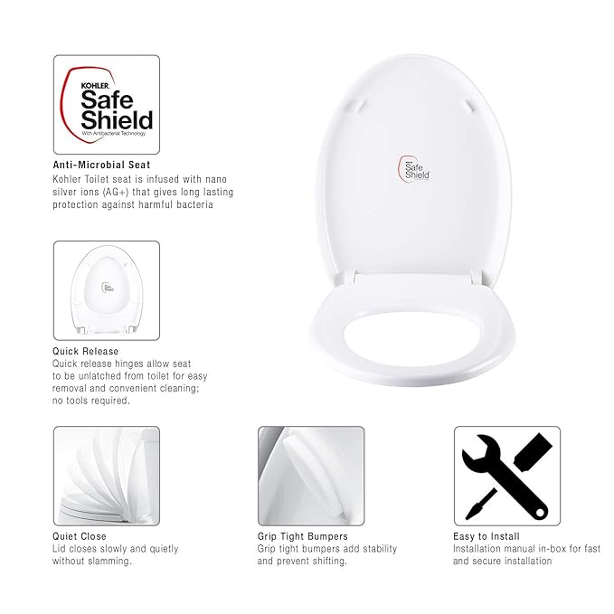 - SafeShieldTM - Kohler Toilet seat is infused with nano silver ions (AG+) that keeps it 99.9% free from bacteria, including highly resistant strains like E.coli.